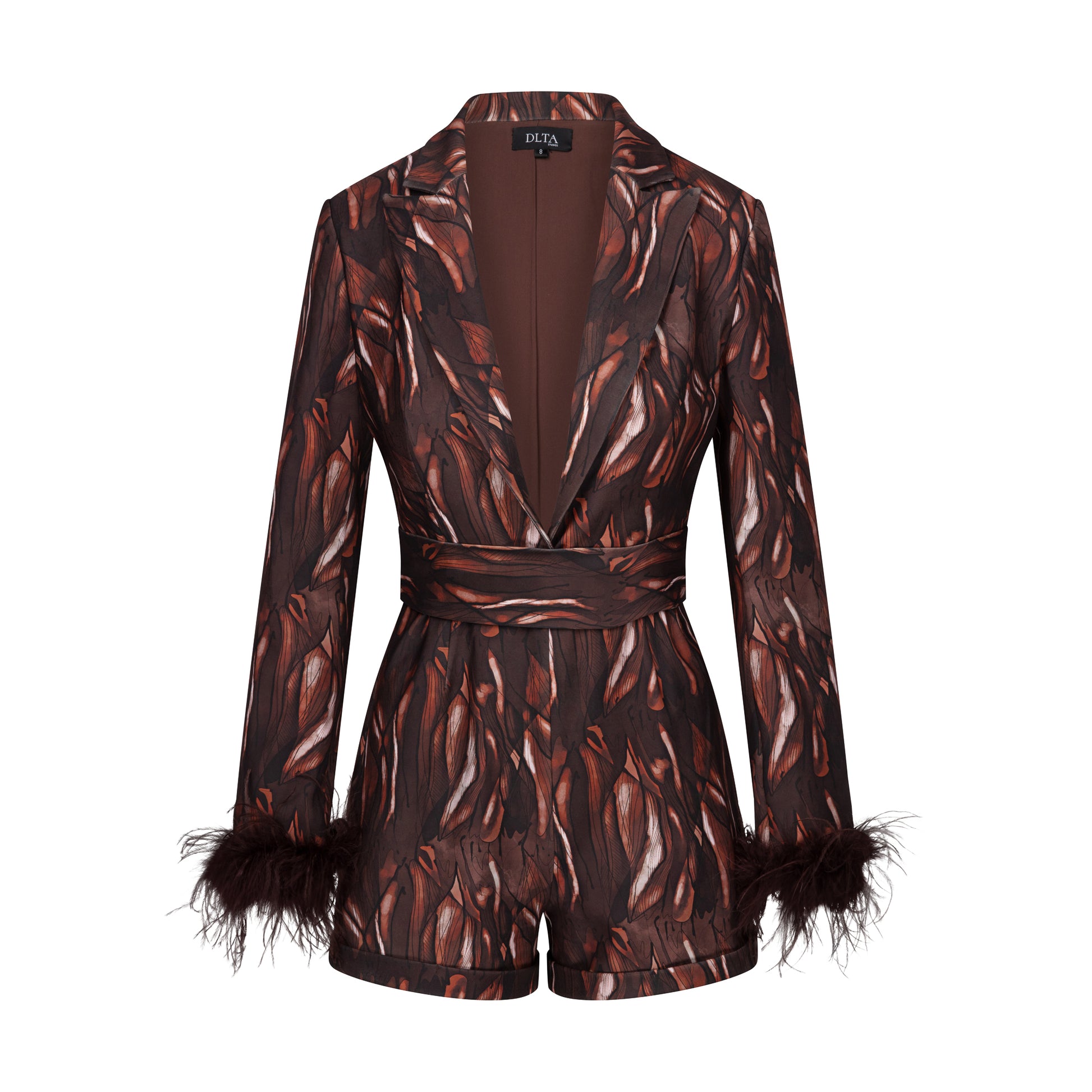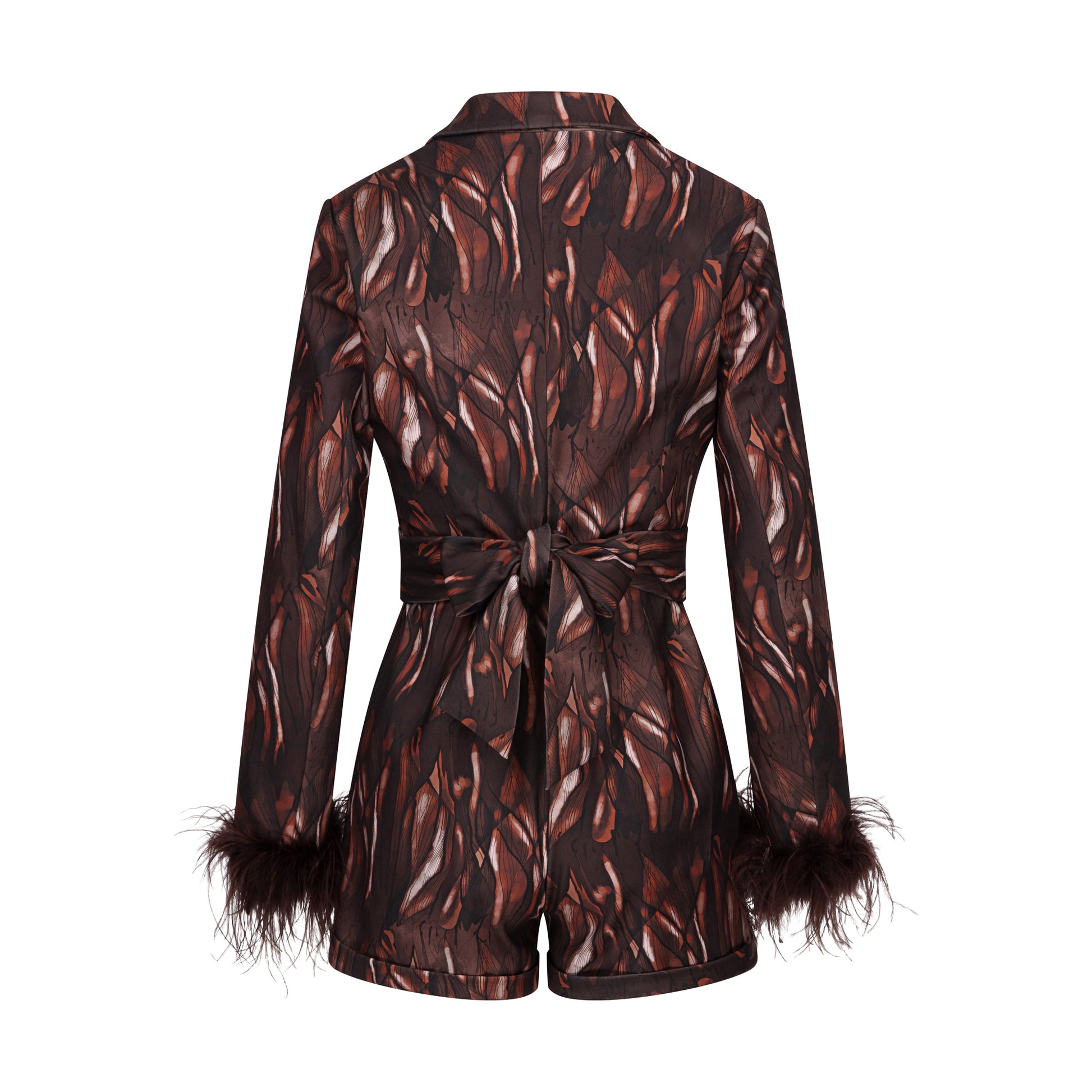 The RUNO Playsuit is where sharp tailoring meets quiet sensuality. Cut in a fluid printed fabric, it features a plunging neckline balanced by structured shoulders and a softly defined waist. The feather-trimmed cuffs add subtle drama, bringing movement and texture to an otherwise sleek silhouette.