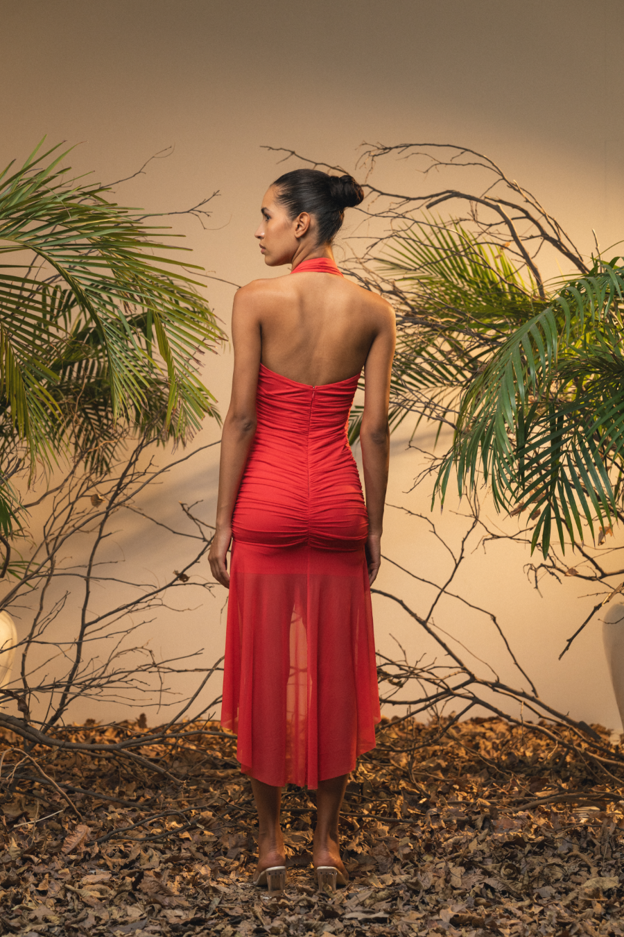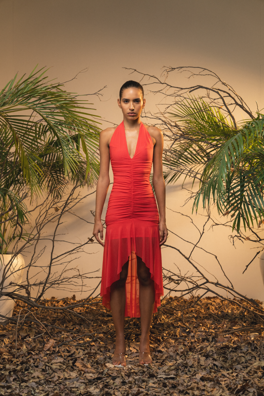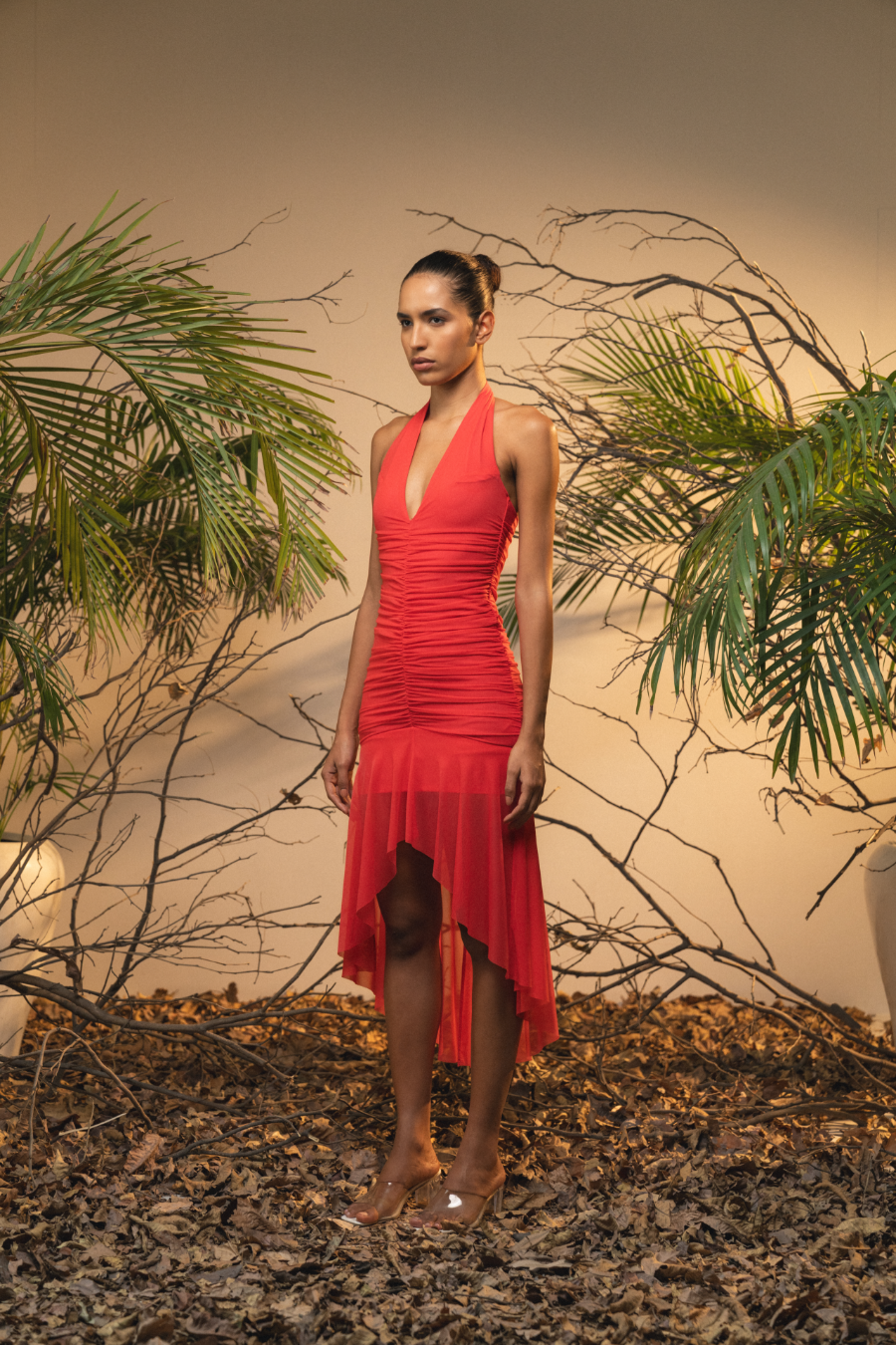 Turn heads in our Seraphina Halter Midi Dress, designed for elegance and allure. Featuring a subtly plunge neckline, curve-enhancing ruching and a flowy-high low hem, this dress is perfect for any upscale occasion. Crafted from premium stretch fabric, it offers both comfort and sophistication. Perfect for a romantic getaway, a destination wedding guest look, or if you are simply going for dinner with the girls. Pair with strappy heels and statement jewellery for an effortlessly chic look.